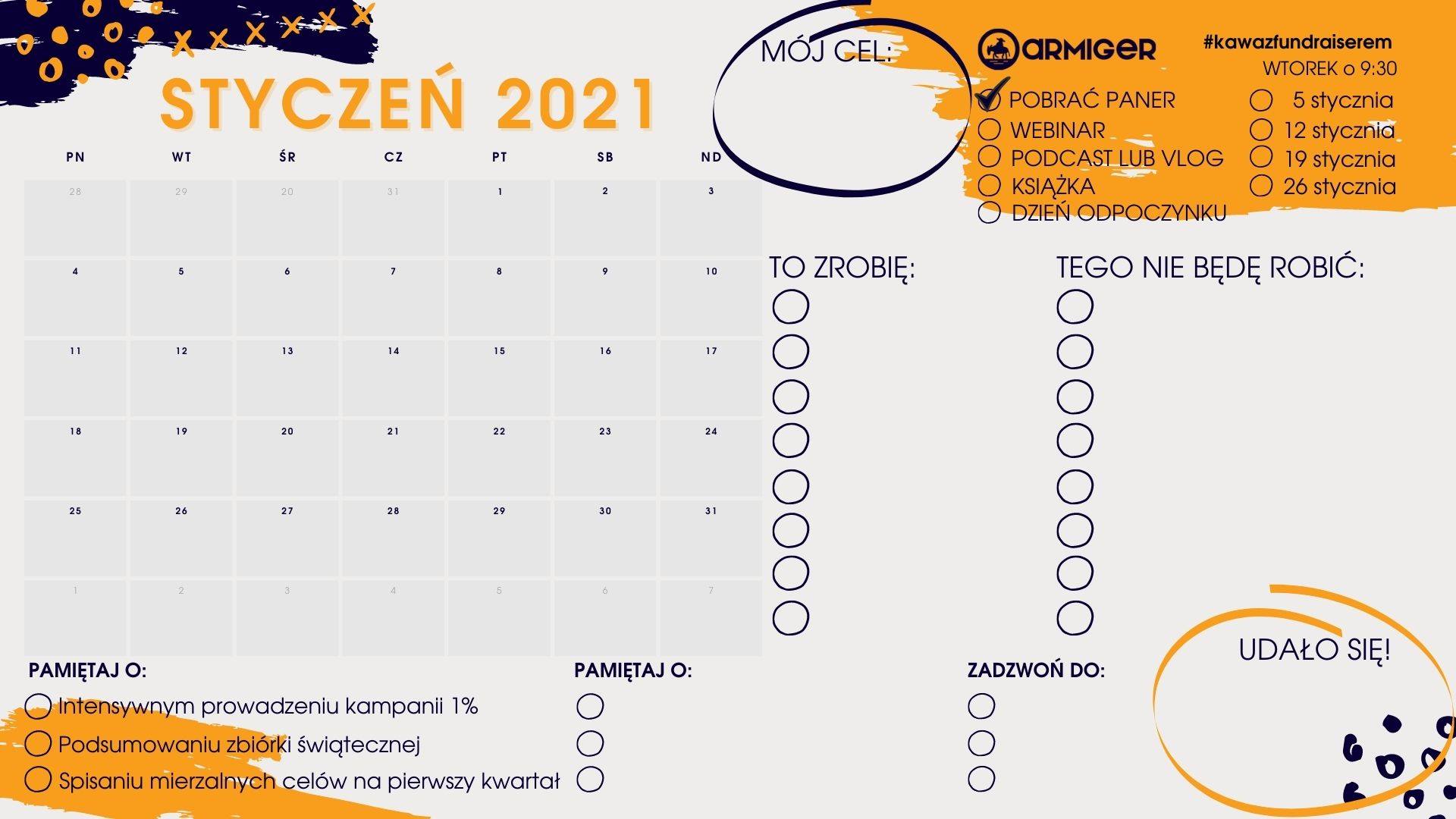 Pobierz Planer Fundraisera: Styczeń 2021 Zaplanuj cały miesiąc, swoje cele i najważniejsze działania! Nie zapomnij o rozwoju i odpoczynku! Pobieram! Chcę dostawać newsletter ze wskazówkami nt. rozwoju NGO z którego mogę wypisać się w dowolnym momencie Pobieram! Za chwilę planer będzie na Twoim komputerze! Niech Ci dobrze służy. To narzędzie, z którego sami korzystamy!